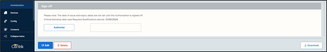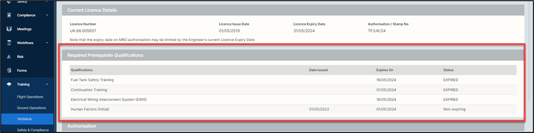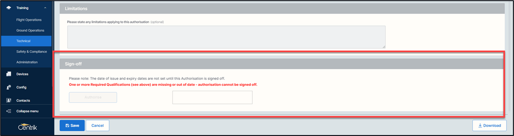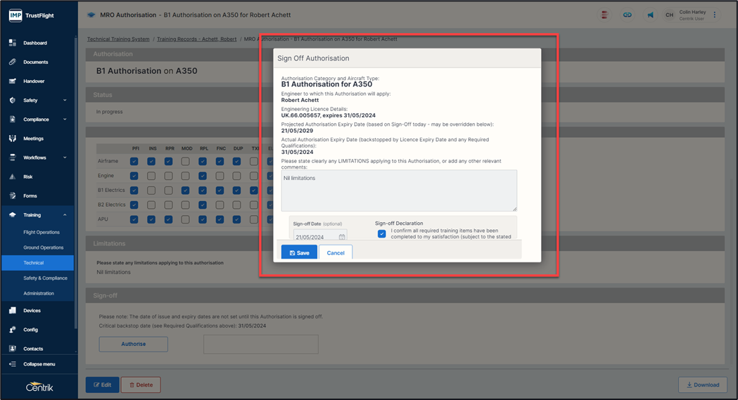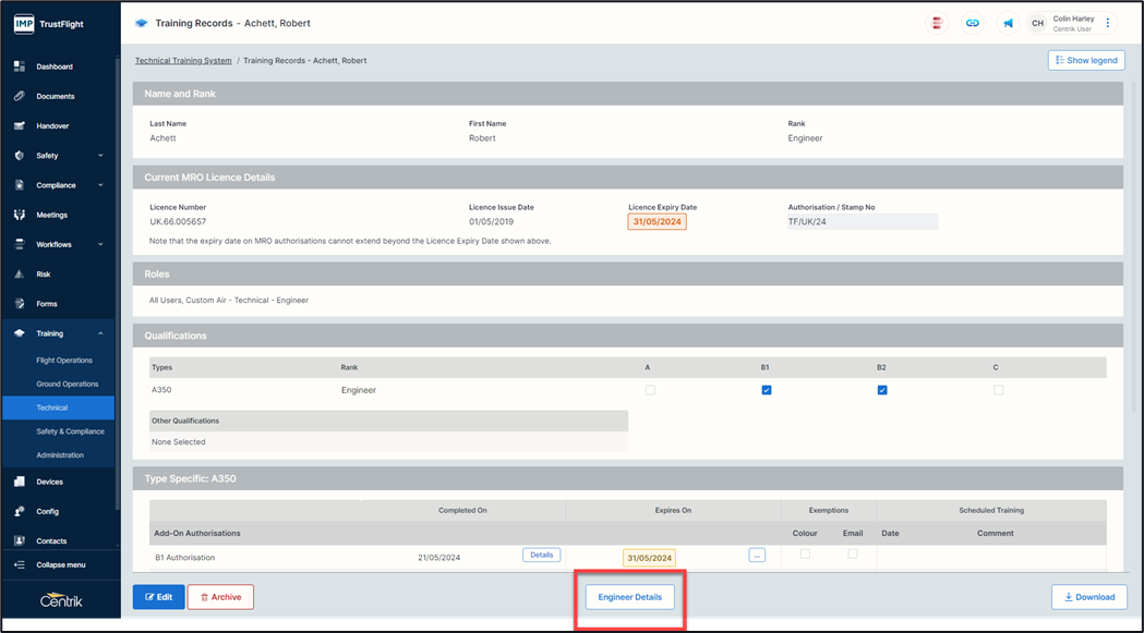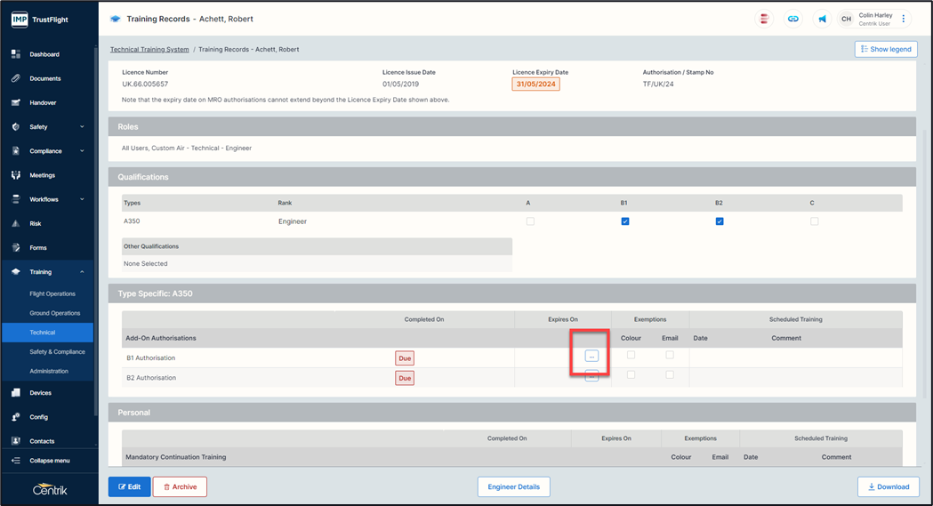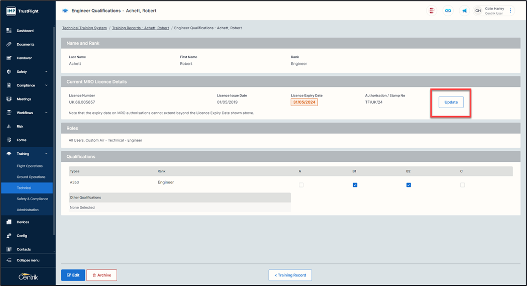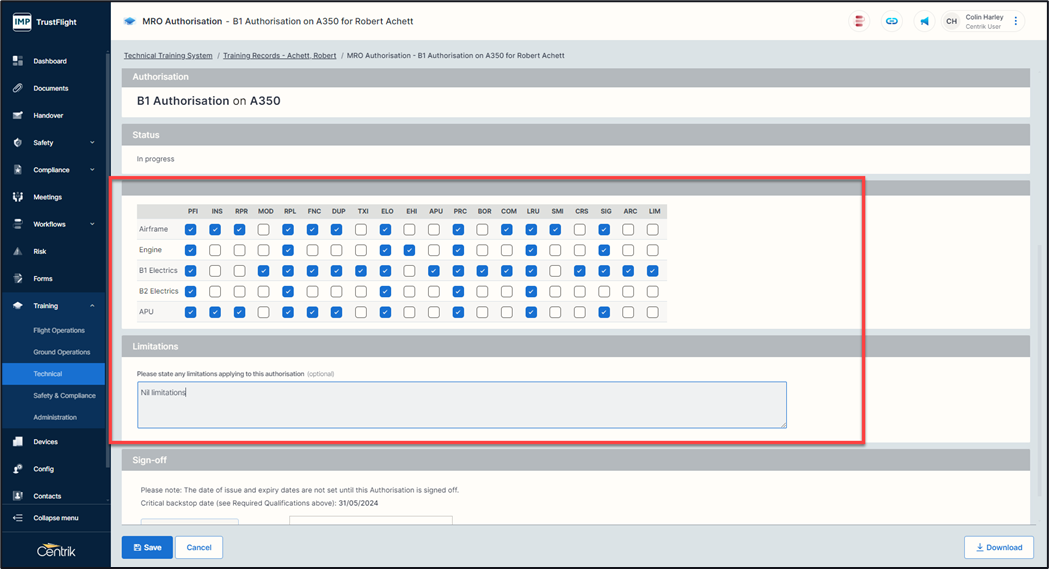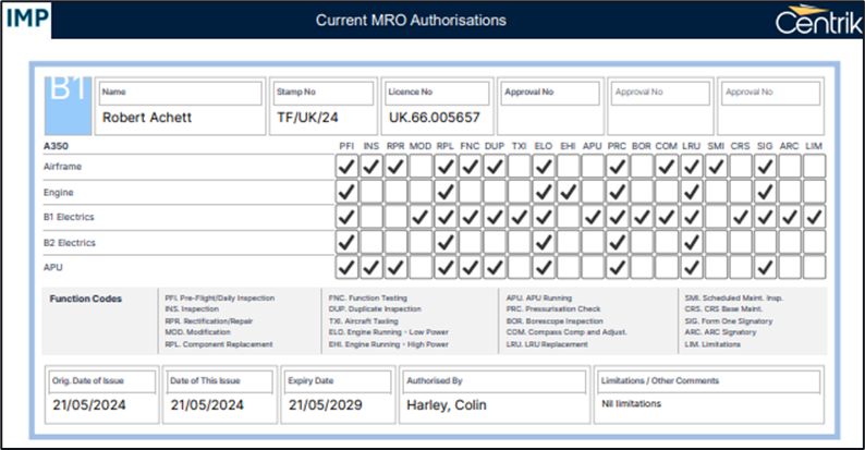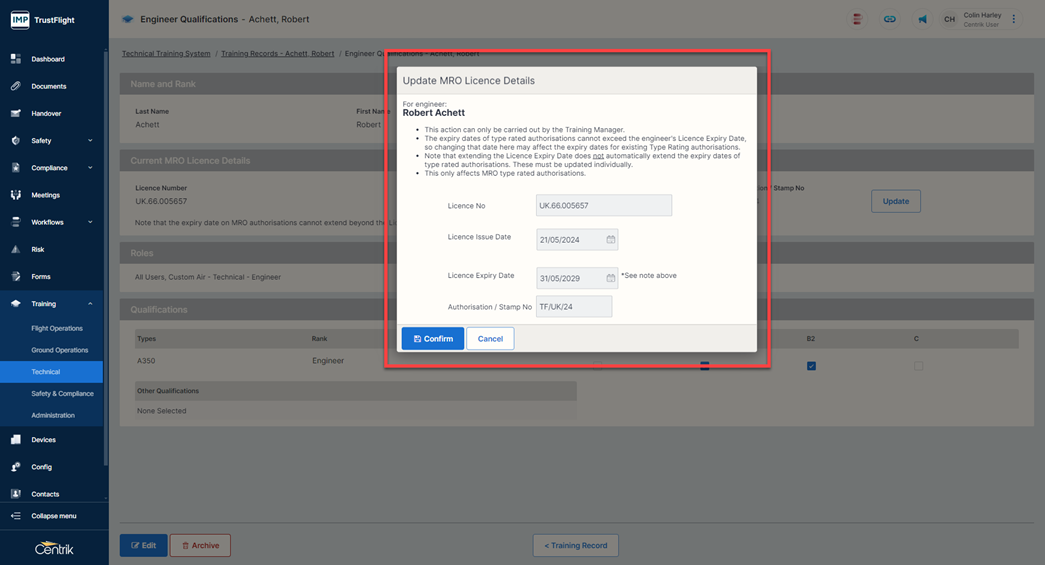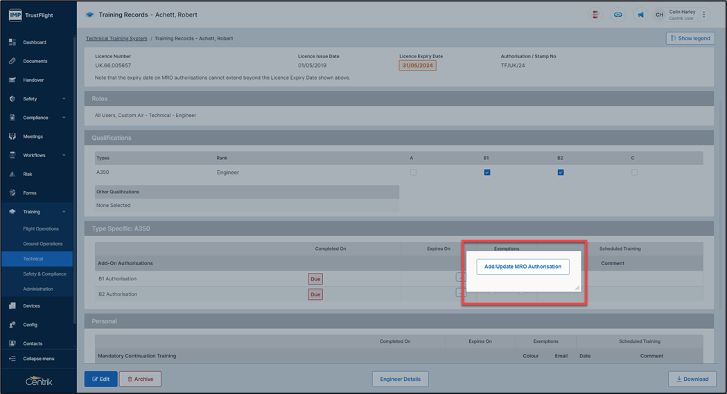 Configuration of your Centrik system can include additional notes for license customisation if required. Once an MRO Licence has been approved it can be downloaded within the individuals training record by using the download function.
