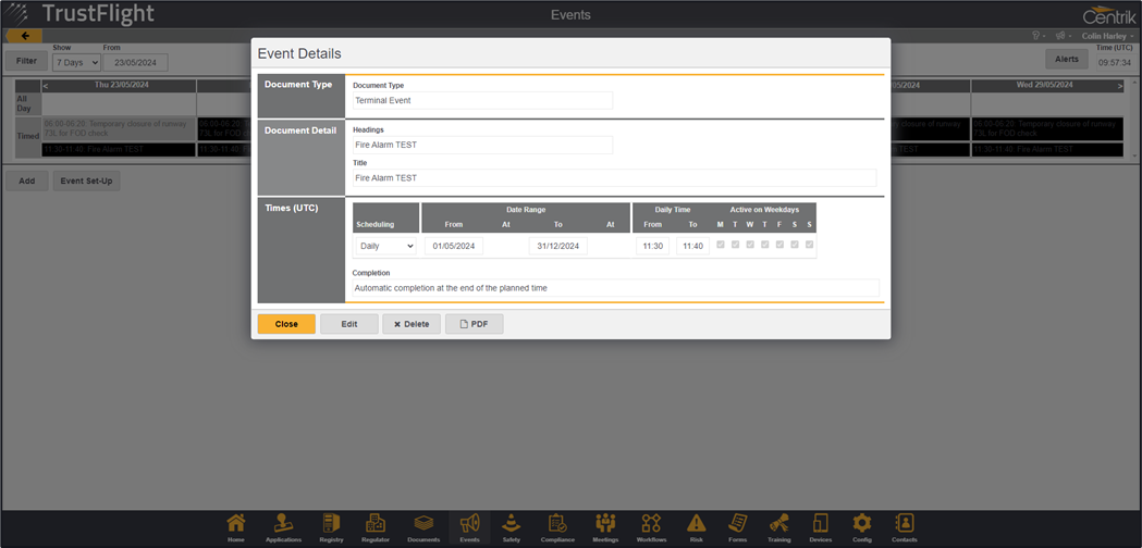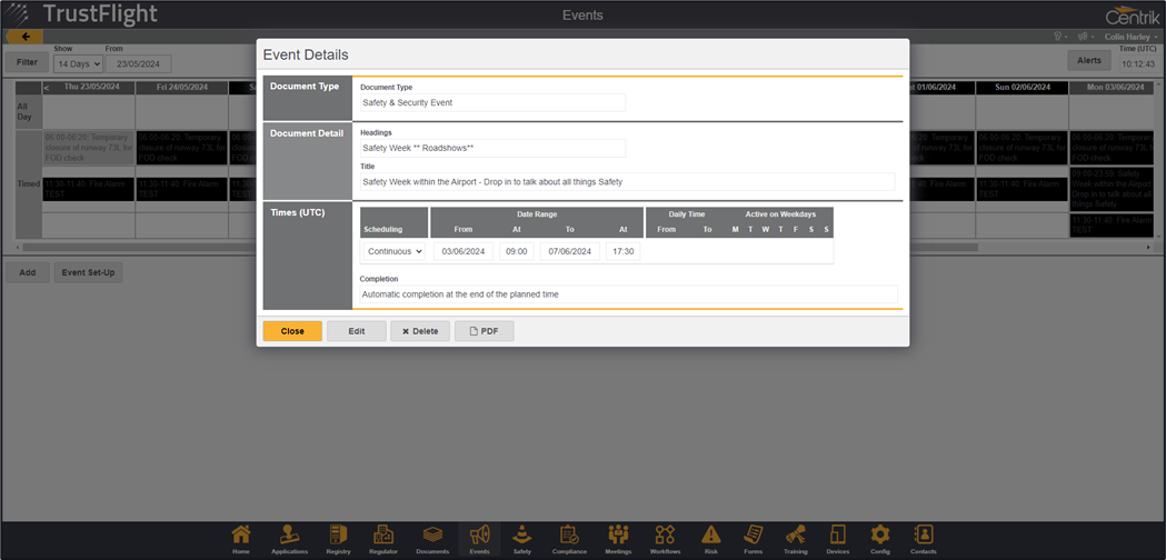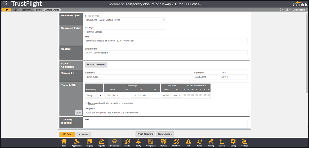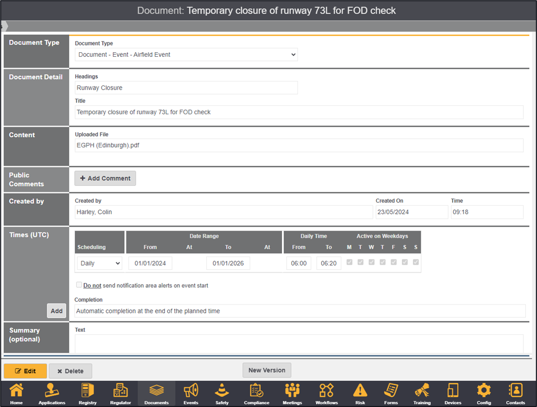 The event has been created, clicking on the event from the event list will show further details of the event alongside the ability to Edit, Delete or view the associated document (the document that was uploaded when the event was created).
