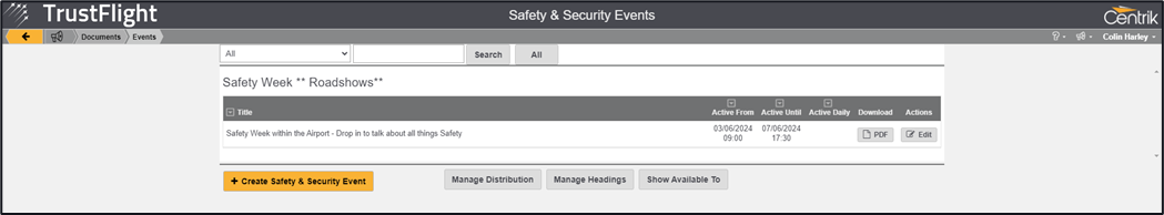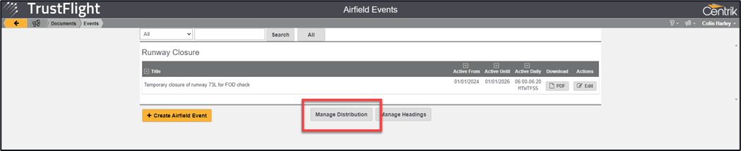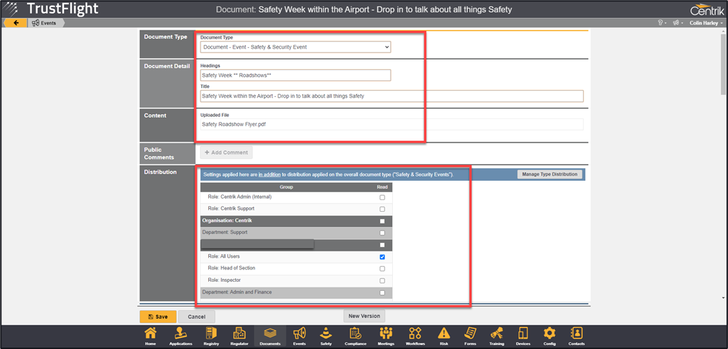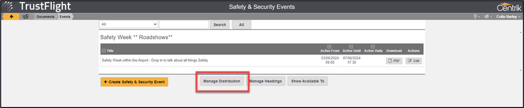 The next step is to decide who within your organisation needs to know about your event. In the same way that documents are distributed you need to distribute your event to your intended audience, this is achieved through the Manage Distribution button.