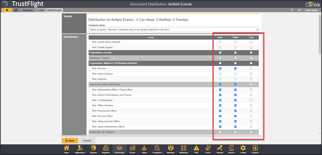 2. Select the Roles within your organisation that you want to notify (depending on the configuration of your site you may have different settings for read, notify and track columns)