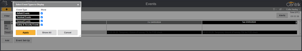 The filter option also allows you to filter by event type.