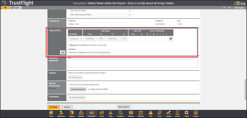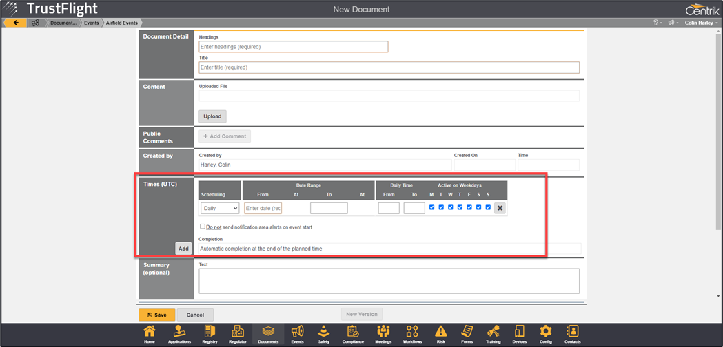 Prior to creating events through the Events module, it is advised to create an Events folder or subfolders within the documents module (folders will need to be configured as Event type folders by the TrustFlight Support team). It is suggested that granular distribution is also used.