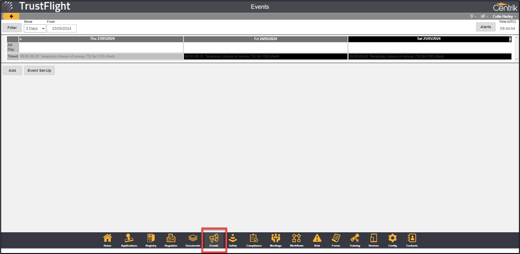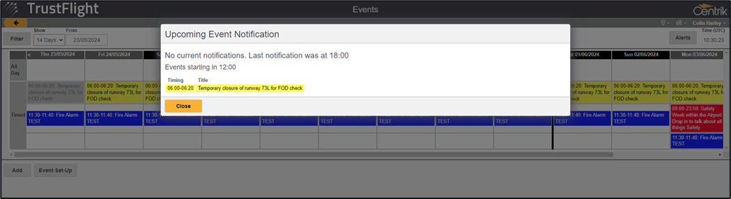 Clicking on the Alerts button will display any upcoming events.