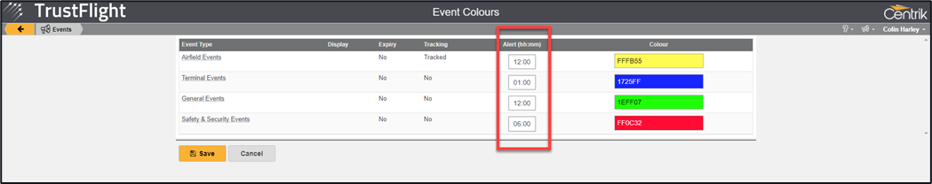 You are also able to stipulate how many hours prior to an event you want notifications to be sent out, this is achieved through the Alerts section, entering in the hh:mm timings.