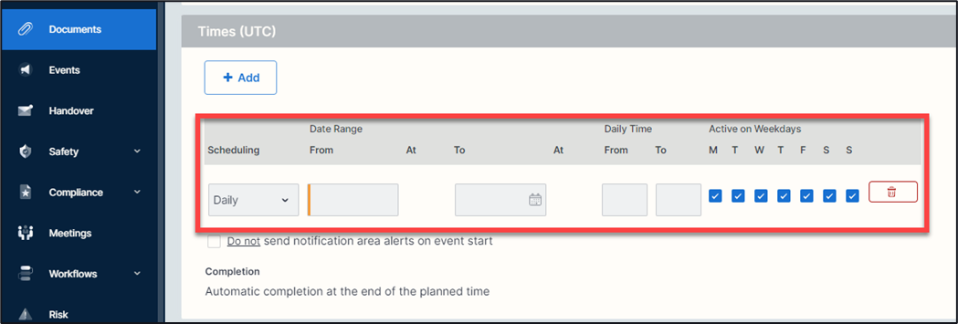 - Daily, a daily event where you are able to select From and To dates along with Times for the event and a schedule (M,T,W,T,F,S,S)