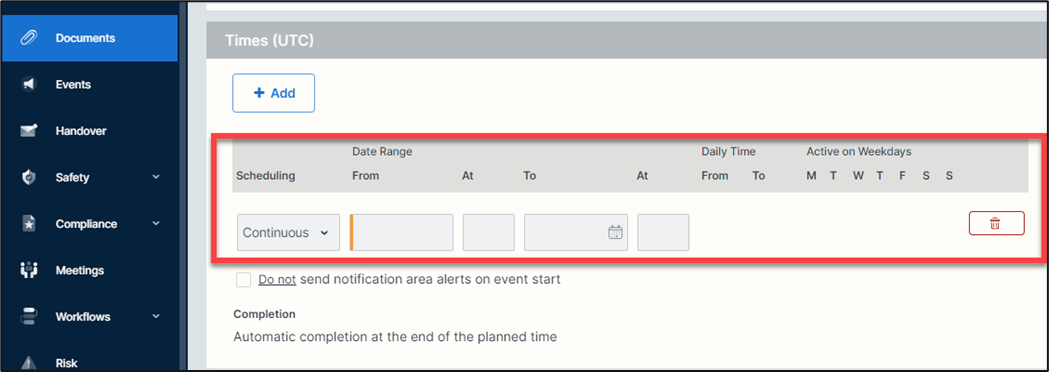 - Continuous, a continuous event by setting a From date, a from time as well as an To (end) date and time