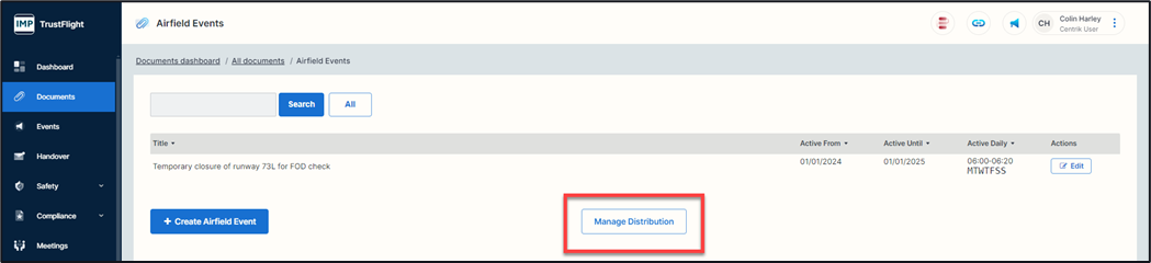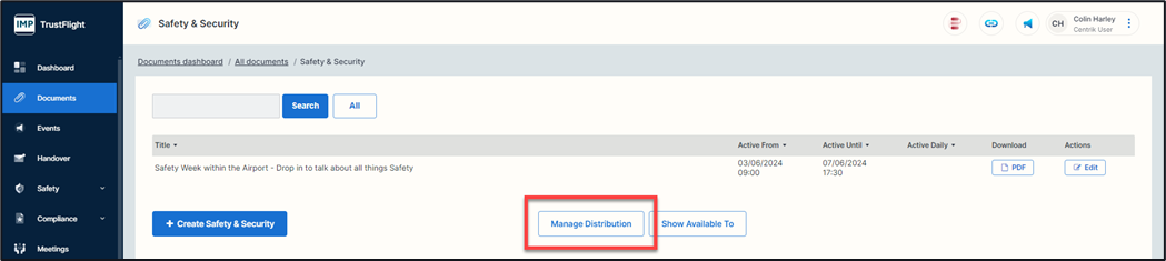 The next step is to decide who within your organisation needs to know about your event. In the same way that documents are distributed you need to distribute your event to your intended audience, this is achieved through the Manage Distribution button.
