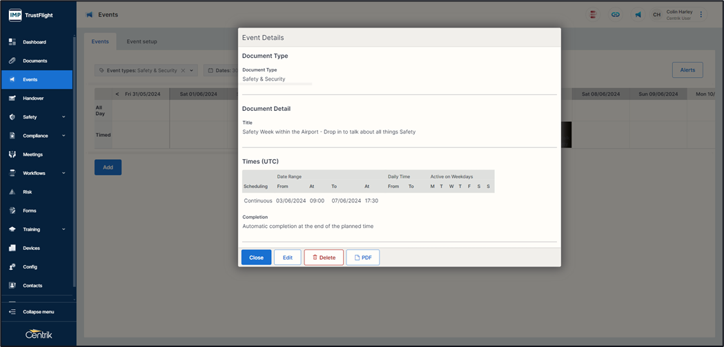 The event has been created, clicking on the event from the event list will show further details of the event alongside the ability to Edit, Delete or view the associated document (the document that was uploaded when the event was created).