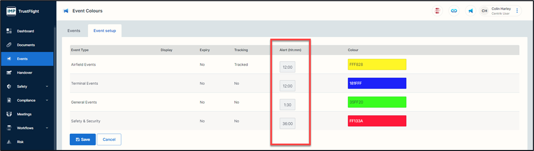 You are also able to stipulate how many hours prior to an event you want notifications to be sent out, this is achieved through the Alerts section, entering in the hh:mm timings.