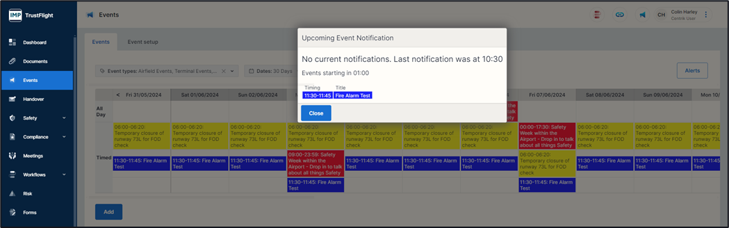 These events are then stored within the events module as well as being communicated through the landing page as a pop-up message.