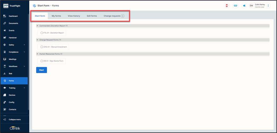 The area where a form can be started, forms are broken down into groups, they can be selected and started from this tab.