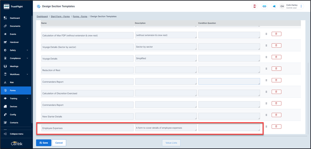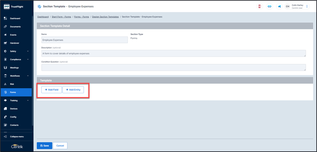 Once a section has been created it can be added to a created form.