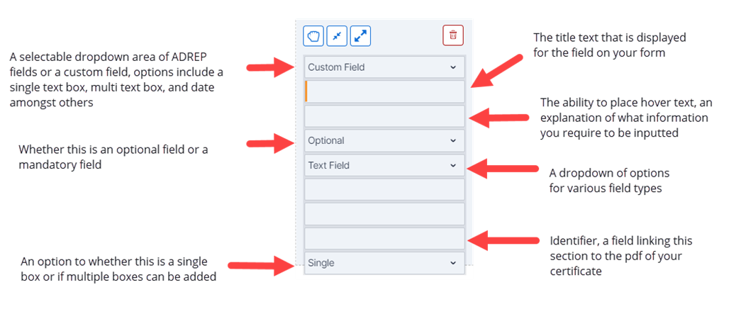 9. Enter in the details for this field, for example if it is a custom field, the text title of the field, whether the field is mandatory or optional, the type of field required and if you can use it only once or multiple times.