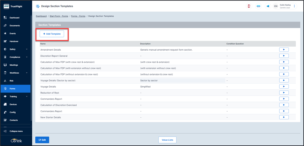 7. Click on the ‘Edit’ button or click on the Section Template Detail section to place the screen into edit mode