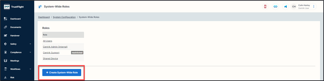 2. To add a new system wide role, click on the ‘+ Create System-Wide Role’ button