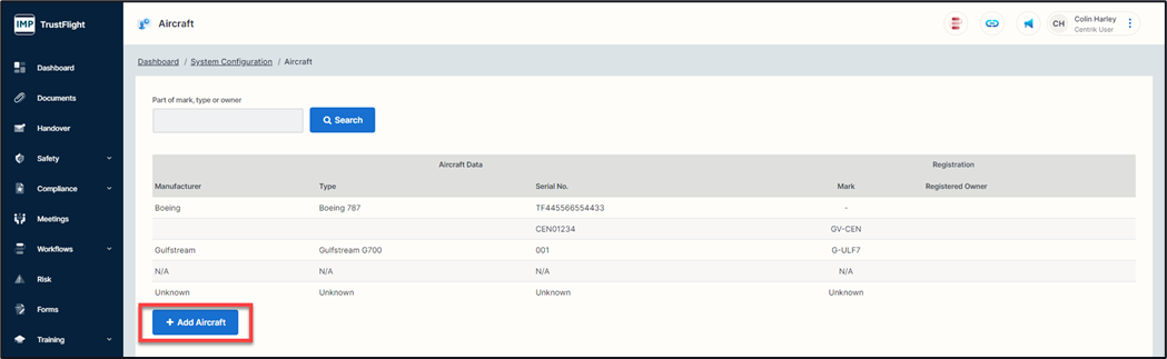 Once the aircraft types have been configured you can add individual Aircraft to your Centrik site including Type Registration, Serial number, Owner and ADREP details