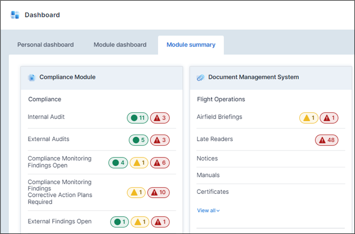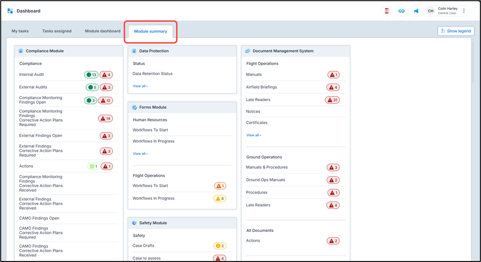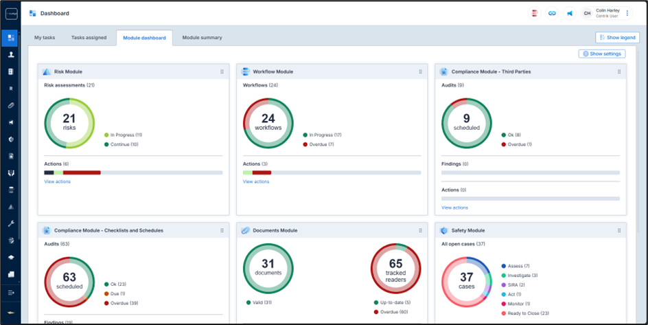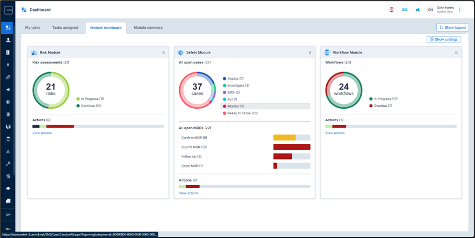 The Module summary is the same view as before, whereas the module dashboard is completely new, made up of graphical and insightful widgets, representing data in the respective modules. The widgets provide “at-a-glance” information but are also interactive, allowing users to view associated tasks and actions.