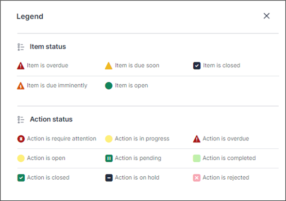 To improve the previous offering of red, yellow and green circular indicators, shapes have been designed to go alongside actions. Users can control whether or not to enable this mode (Accessibility mode) through account settings, which can be found by clicking the username in the top right corner. Note that a legend has been added to the Module dashboard and Module summary tabs, which describes the meaning of each shape.