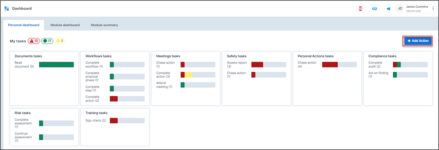 From the Personal dashboard, users will have access to an ‘Add Action’ button on the right. Selecting this opens the familiar ‘New Action’ page, but now a more consolidated view, with fewer sections, meaning less clutter.