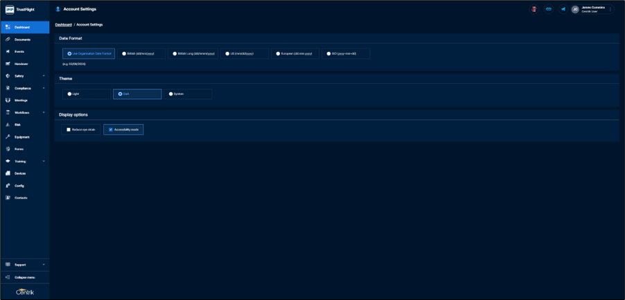 Dark mode can now be toggled on / off within Account settings. If users are sensitive to bright lights, or continually work in low light conditions, there is now an option to customize.