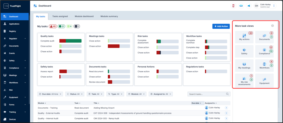 The My tasks area is further supported by the inclusion of the More task views area. This creates a visual indication of your tasks within the associated modules.