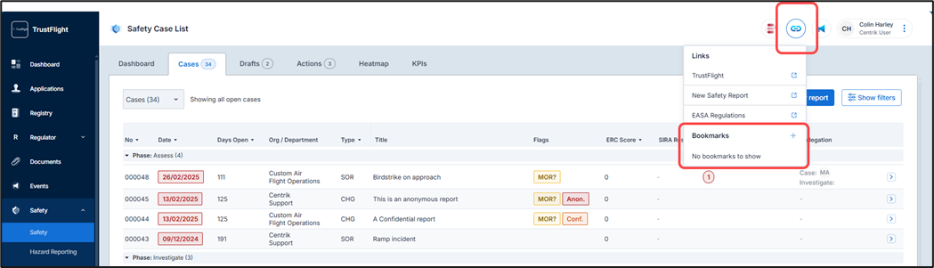 Quick links to Safety reports or external links (configuration required) were previously accessible from the left of the screen in Centrik v4, in Centrik v5 these can be found in the top menu bar.
