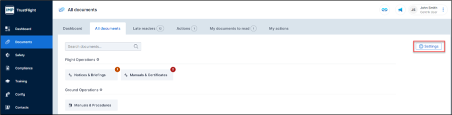 One subtle difference is that the main cog has been replaced by a 'Settings' button (also with a cog), but it is larger and easier to see. This displays a previously unseen area of the system called Advanced Structure Maintenance. This new feature allows orgainsations to create their own document folder structure without the need, or requirement to contact TrustFlight Support teams.