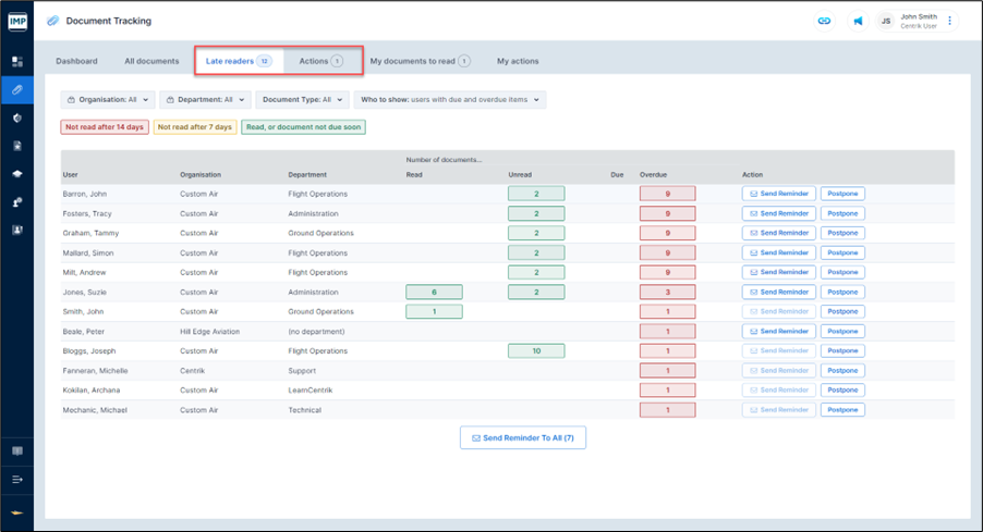 Users with these access rights selected will have the option to view ‘Late readers’ and a consolidated list of actions from the Documents module.