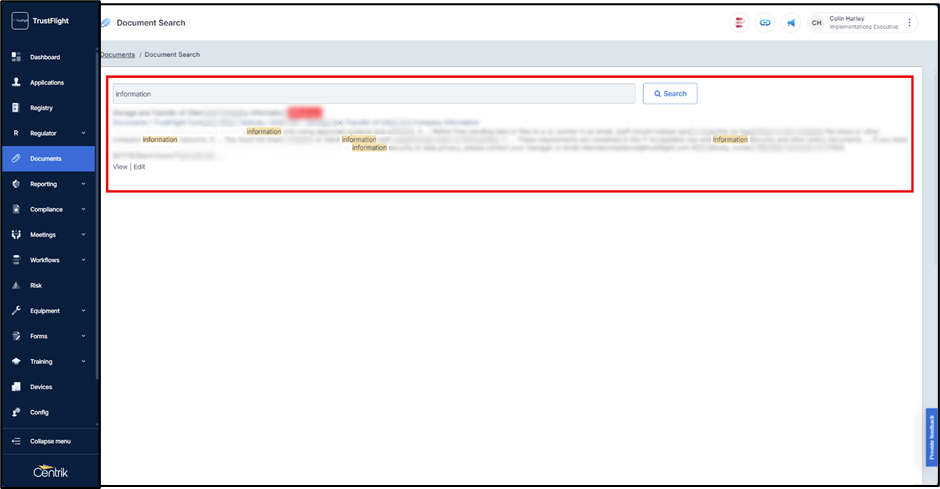 Alternatively, to return title and content results, users must first enter text into the search box then select the search icon (or press enter). Doing this will display a different page, highlighting every document containing the specified wording.