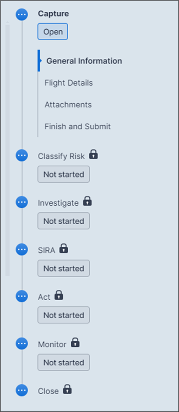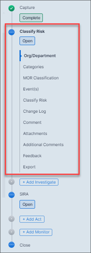 Similar to the Capture phase, navigation is easier and offers greater granularity. Beneath the Classify Risk heading, there are interactive subheadings representing each section of the phase.