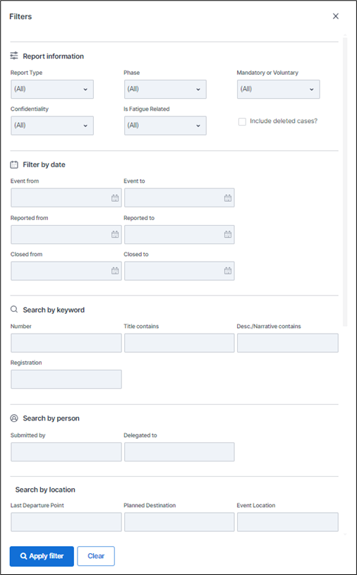Using the dropdown, users can still view specific types of cases, for 'Cases', 'My Cases', ‘Inbox’, ‘MOR’s’ and ‘SIRAs’ (these are the SIRAs created within the reporting module). This removes the need to have separate individual buttons.