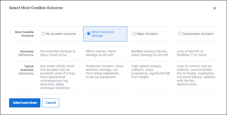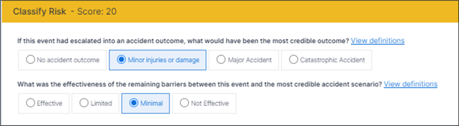 When it comes to choosing the appropriate Event Risk Classification, the process has been simplified. Safety Managers can click directly on the editable area and make the selections for the ‘Most Credible Outcome’ and the ‘Effectiveness of Barriers’ in one transaction, to determine an immediate risk score.