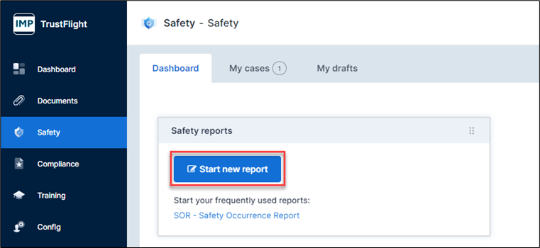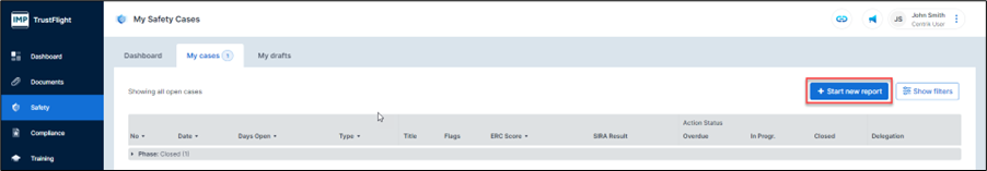 It is now possible to start a new safety report from the Safety Dashboard, and from the ‘My cases’ tab.
