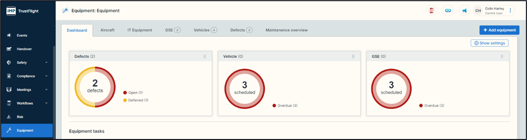 An area that displays my equipment defects, those that have been raised, allocated, or deferred to me alongside the different equipment classes.