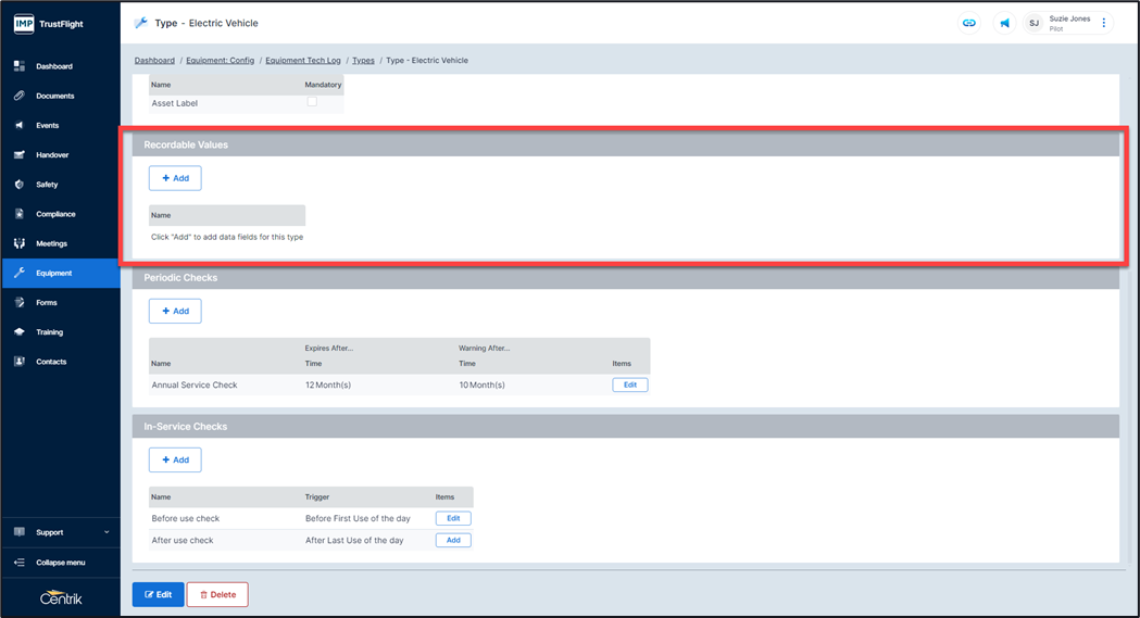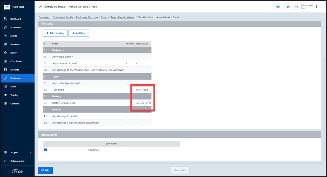 4. Navigate to either the Periodic checks area or the In-service checks area, click on the ‘Edit’ button under the Items area