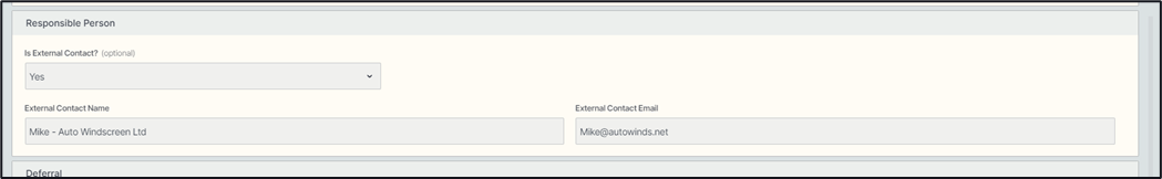 The next section relates to the individual responsible for rectifying the defect and is titled Responsible Person. It is within this section that the individual responsible for fixing this defect can be inputted. There is a selectable option of this individual being an External Contact, in essence they don’t have access to your Centrik system, selecting this as YES will create areas for an External Contact Name and External Contact Email to be added. If the individual responsible is an internal contact, then typing in their name in the available field will allow you to select from the list.