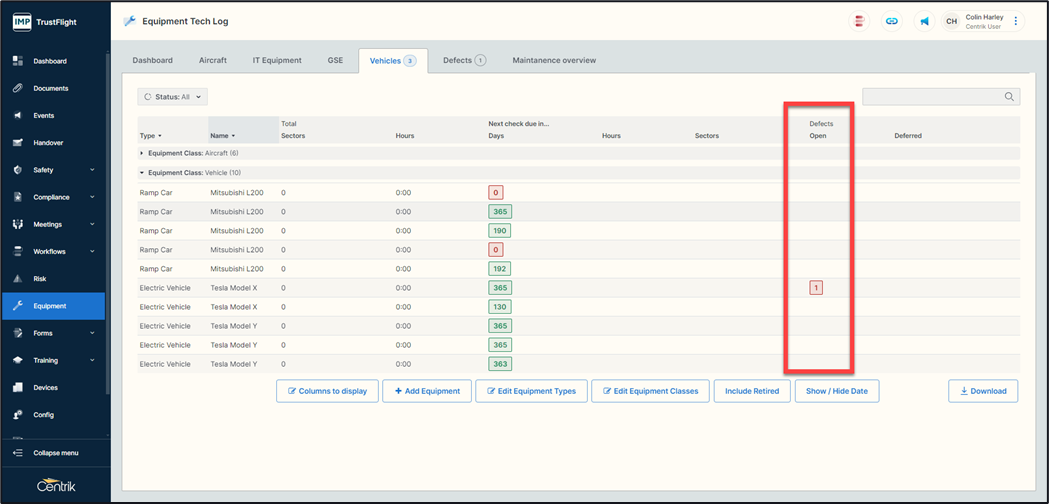 Now that a defect has been raised you are able to view it within the class tab of that equipment under a section titled Defects Open.