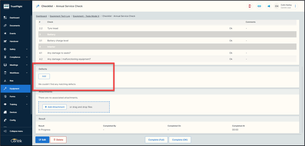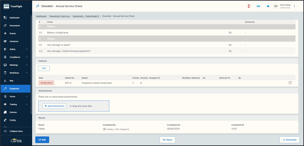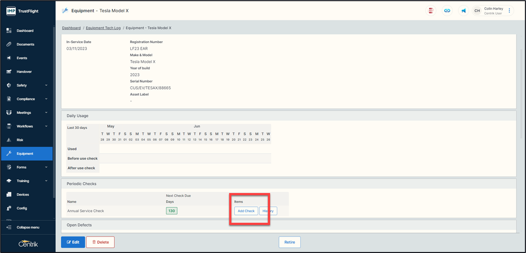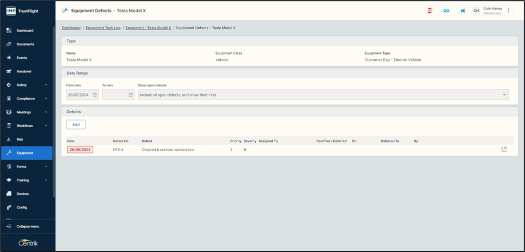 Navigating back to this specific piece of equipment will highlight any open defects, there is also the ability on this page to add a defect outside of a check by clicking on the ‘Add’ button and following the same process.
