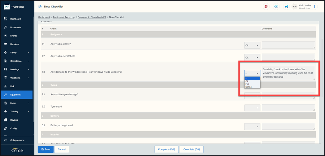 3. Carry out the list of checks, selecting from the dropdowns available. If an item fails the checklist due to a defect, select this from the available list and add a comment if necessary