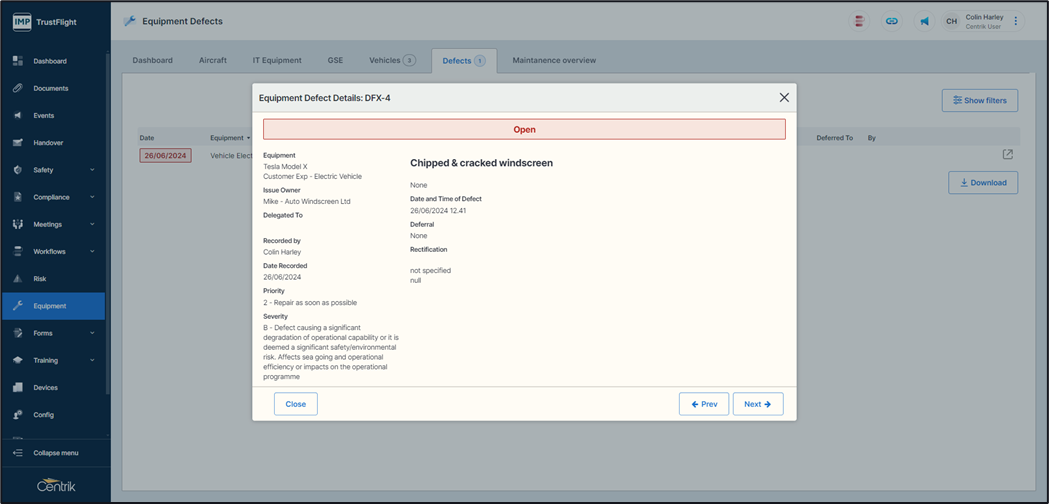 It is important that when an individual uses a piece of equipment that it works, this means recording maintenance for that piece of equipment as well as logging any defects that might occur, once a defect is logged it’s important to then track it against its impact to the business and record its rectification. This can be all achieved within Centrik, additional configuration can also alert an individual in an organisation when a defect has been raised.