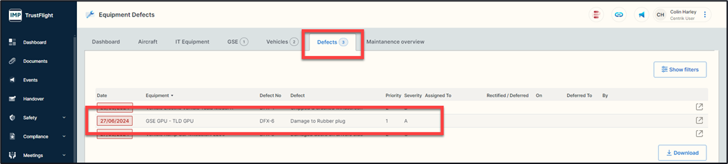 1. Follow the link to the open defect, or click on the defects tab and click on the name of the equipment that you wish to select