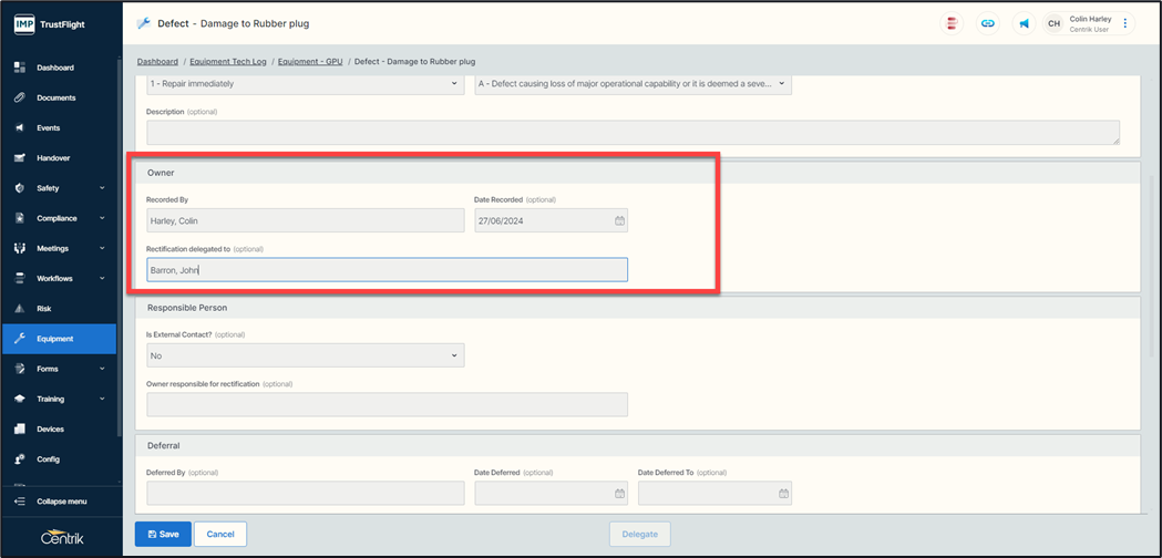 Once selected the Responsible Person can choose to enter in a Deferral, a Rectification, or to Delegate the defect to another individual.
