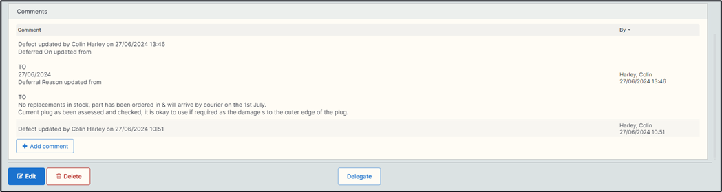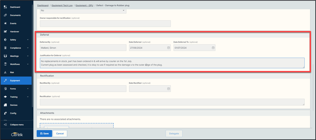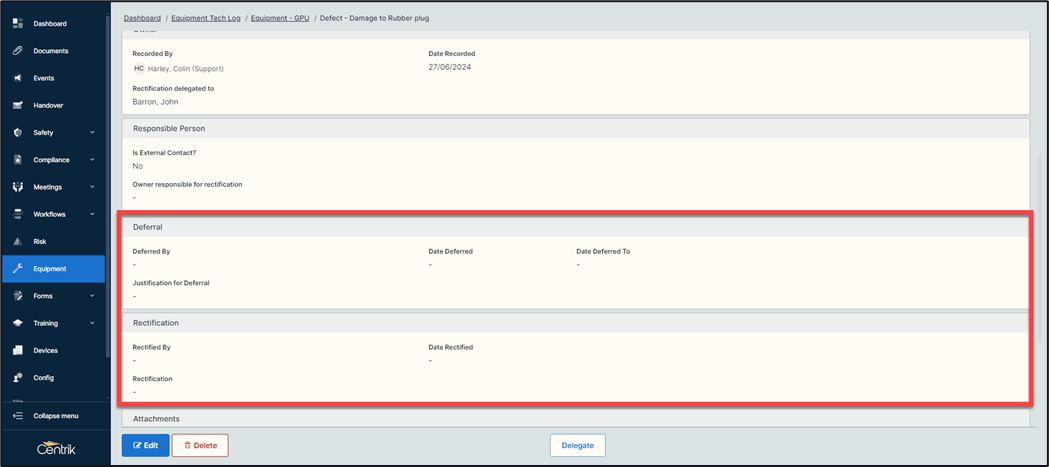 Once selected the Responsible Person can choose to enter in a Deferral, a Rectification, or to Delegate the defect to another individual.
