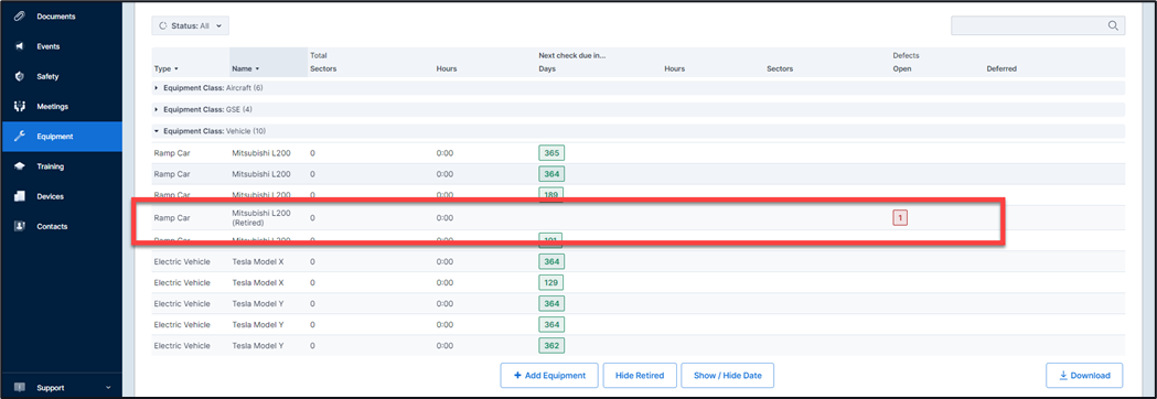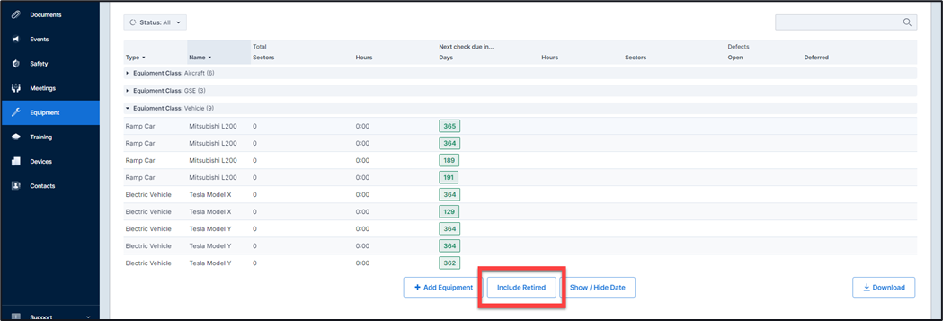 Retire items will not dislay on your equipment lists by defult. To enable you to view them click on the ‘Include Retired’ button within that equipment class tab.