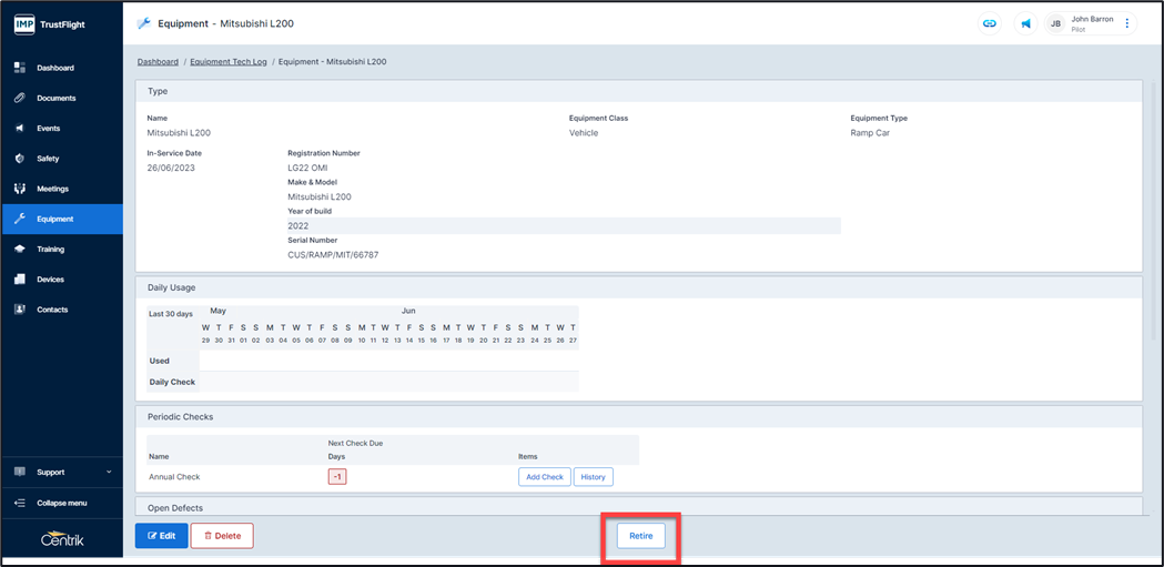 If a piece of equipment is surplus to requirements or if a raised defect means that a piece of equipment must be sent to a specialist for repair then it might be out of your asset list for a few weeks, or months. In this scenario there is a ‘Retire’ button at the bottom of each specific item of equipment, pressing this will remove it from your asset list, once retired this button changes to read ‘Restore’, clicking on this button will restore it to your asset library.