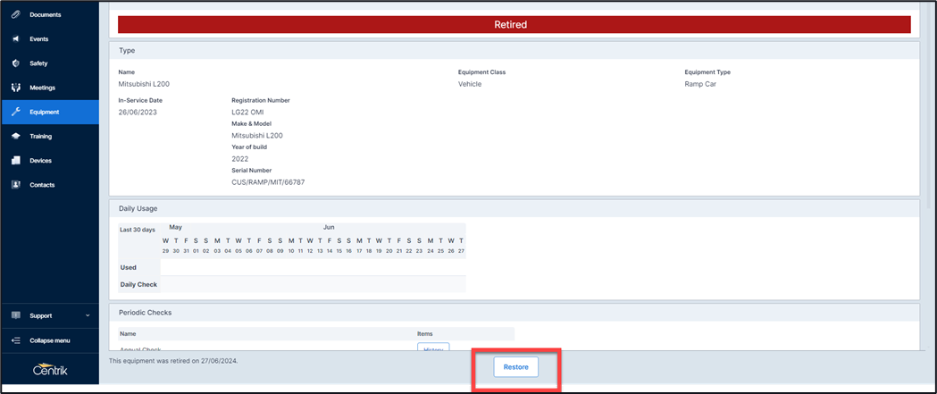 Once a piece if equipment has been retired the ‘Retire’ button changes to a ‘Restore’ button. Clicking on the ‘Restore’ button will unretire this equipment and place it back onto your equipment list.