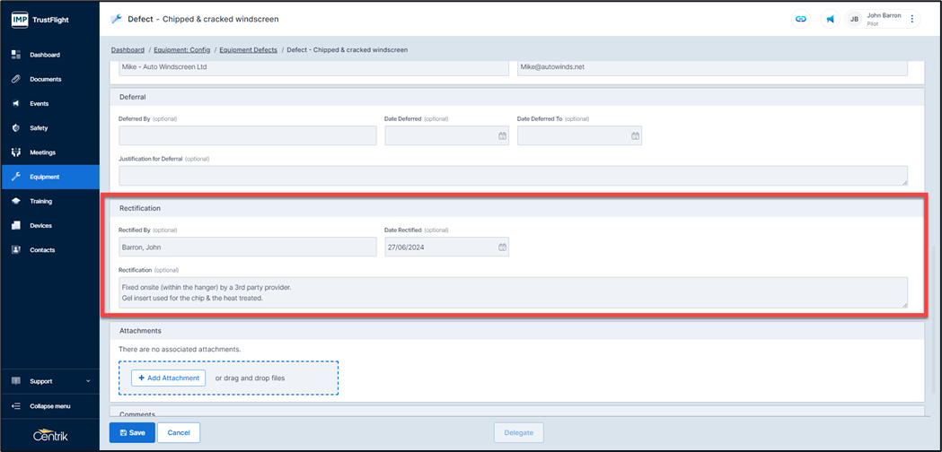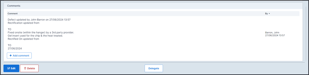 Once selected the Responsible Person can choose to enter in a Deferral, a Rectification, or to Delegate the defect to another individual.
