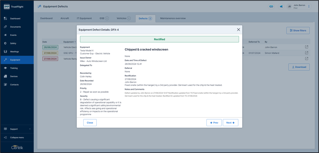 Clicking on the pop out option will display this defect in detail, once again the ‘Prev’ and ‘Next’ buttons can be used to look through previous and next (the defect that is after the one you are viewing) defects.