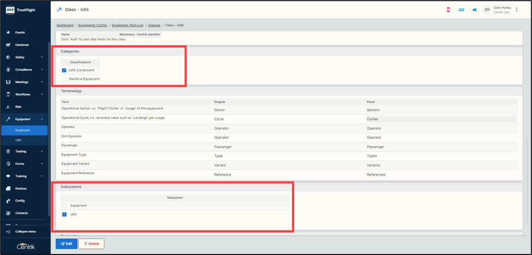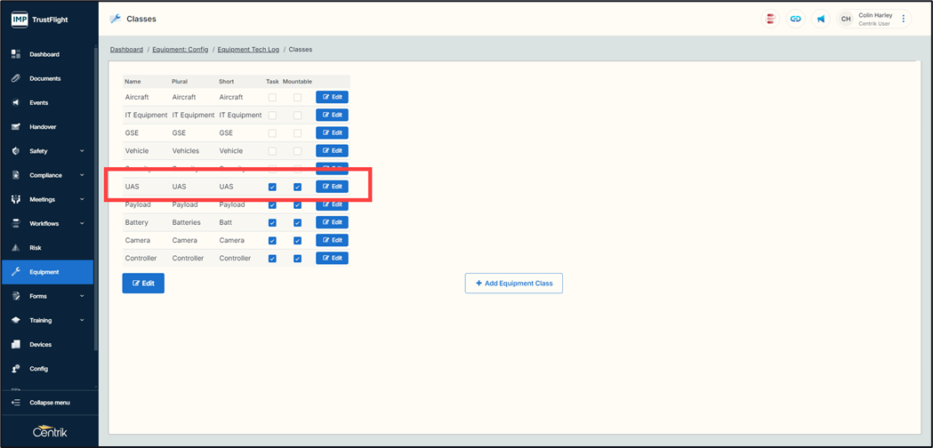 UAV equipment is created in a similar way as any other equipment within Centrik. There is however a small difference, the equipment module is linked closely with the tasking module so in the equipment creation this needs to be reflected.