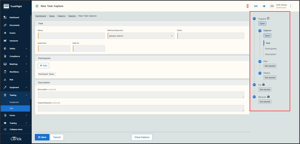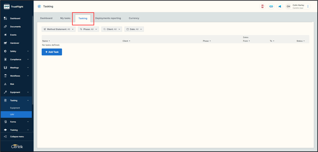 Once a Method Statement has been created you are able to create a Task, this is the area that records your flights.